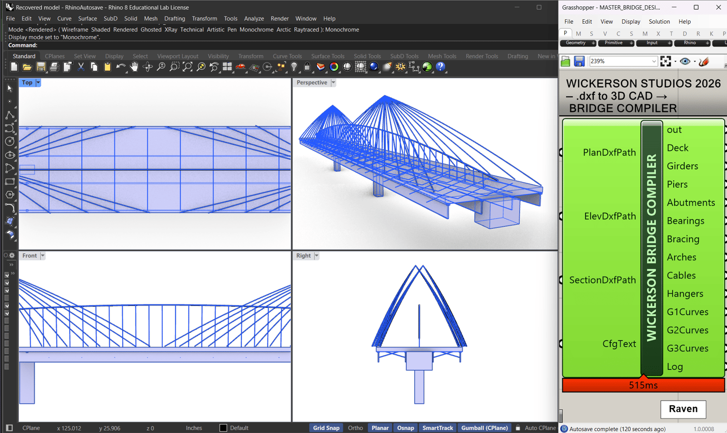 BridgeDesigner MinCore is an advanced 3D bridge modeling system developed by Wickerson Studios that transforms pure, annotation-free DXF plan / elevation / section drawings into a fully registered, structurally coherent 3D CAD bridge assembly.