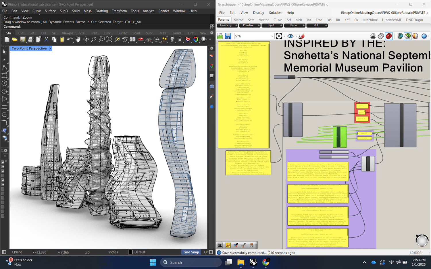 - Lofted massing Breps (taper/twist/setbacks/wobble)