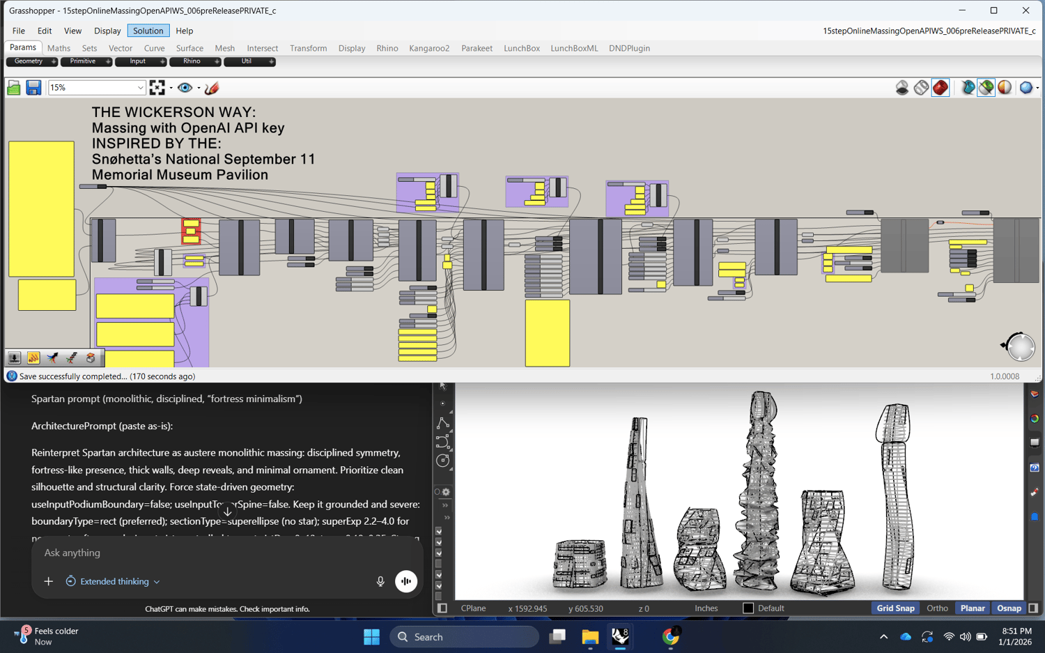 This Grasshopper C# STEP_00 → STEP_10 pipeline is a production-minded research system for generating high-LOD architectural massings and 3D CAD geometry assemblies from compact text control strings (cfg) plus narrative intent channels (sfg)—optionally driven by an OpenAI key for rapid design iteration and style steering.