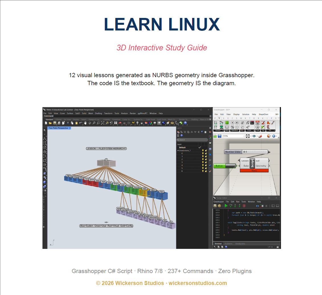 Learn Linux — 3D Interactive Study Guide | Grasshopper C# Script | 12 Lessons