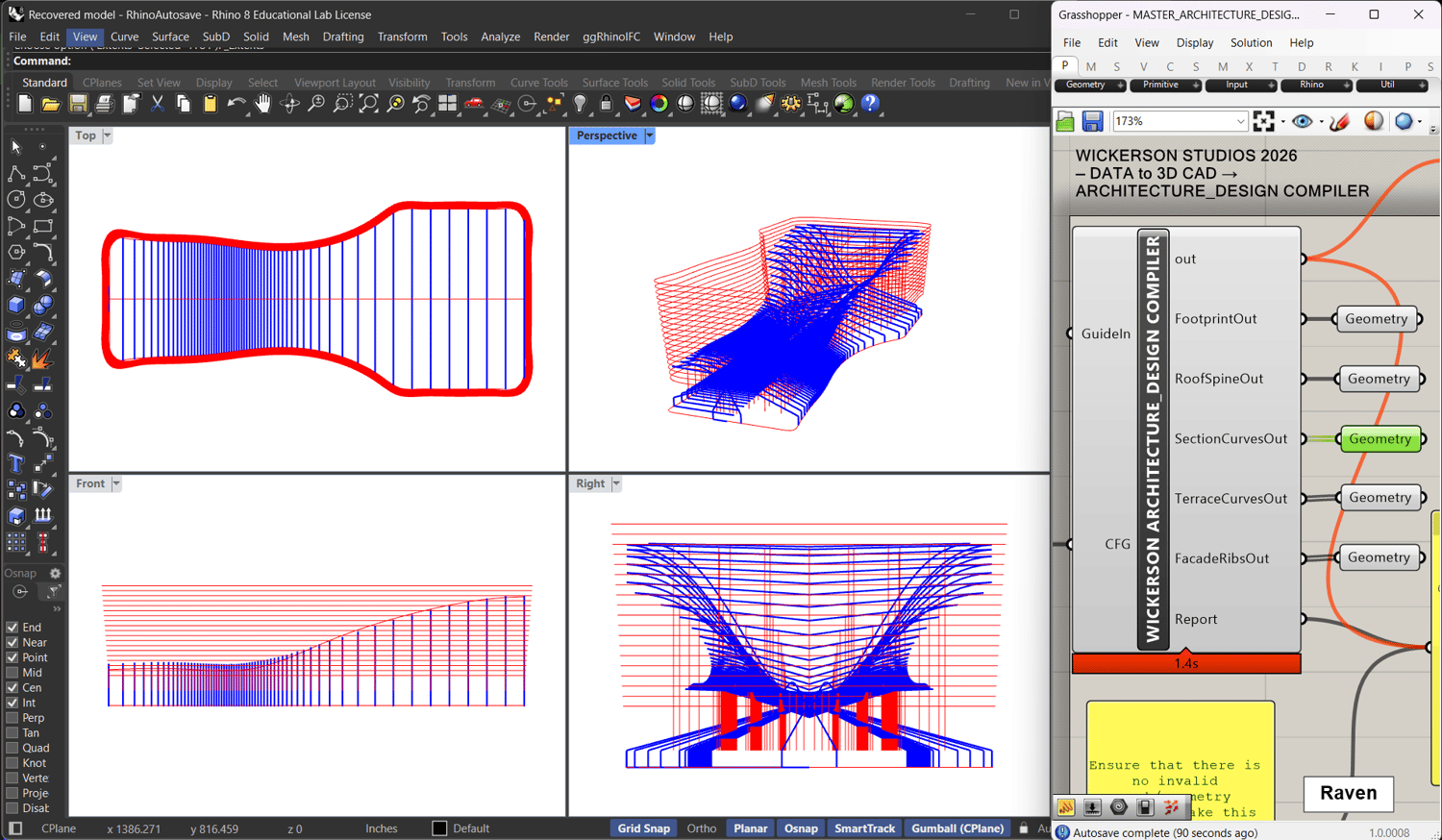 ArchCompiler generates a complete architectural curve framework ready for downstream modeling, rationalization, and construction workflows: