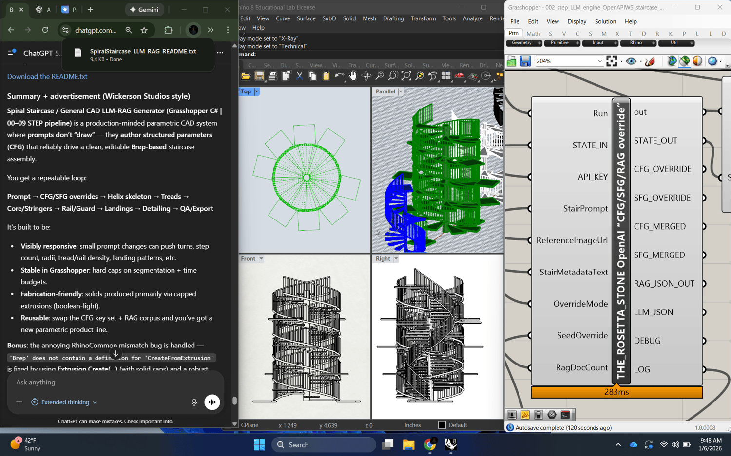 Spiral Staircase / General CAD LLM-RAG Generator (Grasshopper C# | 00–09 STEP pipeline) is a production-minded parametric CAD system where prompts don’t “draw” — they author structured parameters (CFG) that reliably drive a clean, editable Brep-based staircase assembly.