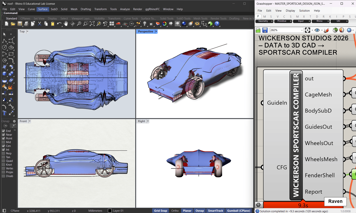 Hypercar SubD Cage Master is a Grasshopper-driven body generation system designed for real sports car proportions, not abstract blobs. It produces a clean, editable SubD-ready body cage with correct left/right symmetry, a distinct front and rear, and high-LOD wheels aligned exactly as they should be.