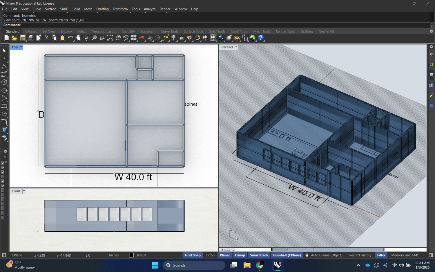 notes: prioritize readable plans; stable booleans; cap openings/walls for performance; generate annotations scaled for Rhino viewports.