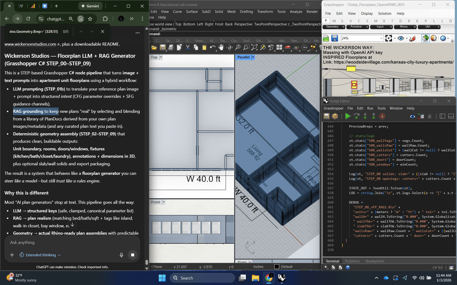 1) What this is This product is a STEP-based Grasshopper C# node pipeline that uses: • LLM prompting (image + text) to derive structured plan intent + parameters • RAG (Retrieval-Augmented Generation) to “ground” new unit layouts in a libra...